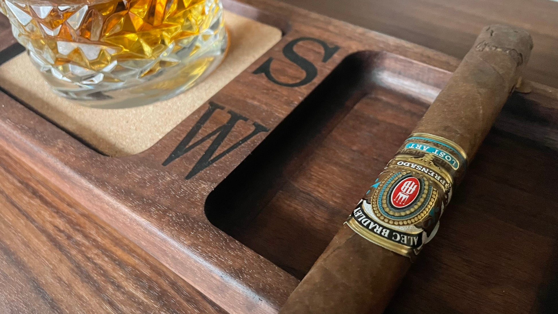 Order your Walnut Whiskey and Cigar Tray today and create a luxurious haven for your next smoke session! (Whiskey and cigars not included)